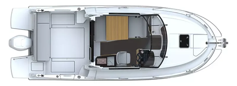 La banqueta de popa está sustituida por una estación de pesca dotada de portacañas de calidad profesional. Además del vivero con circulación de agua, tres compartimentos de estiba están acondicionados bajo la cubierta, uno de los cuales puede albergar una cubeta para pescados.